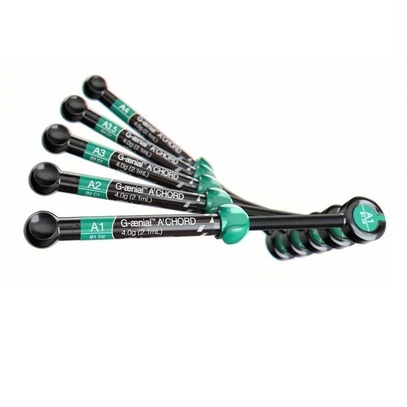 - G-ænial A’CHORD е усъвършенстван универсален композит за директни възстановявания – предни и задни със значително опростена система от нюанси. Материалът комбинира висока естетика, издръжливост и лесна работа, като покрива 90% от клиничните случаи само с 5 основни цвята (CORE).